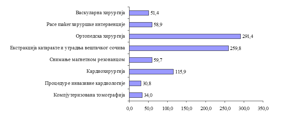 U 2012. godini najduže se čekalo na ortopedske operacije odnosno artroplastike kuka i kolena, za koje se u proseku čekalo 291,4 dana, kao i za operacije ekstrakcije katarakte i ugradnje veštačkog sočiva, na koje se u proseku čekalo 259,8 dana. Najkraće se čekalo na procedure invazivne kardiologije – 30,8 dana (grafikon 1)