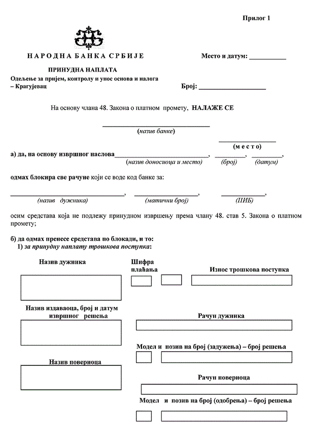 Banci kod koje dužnik ima najviši iznos sredstava na dinarskom računu, Prinudna naplata u Kragujevcu elektronskom poštom dostavlja osnov s nalogom na obrascu iz stava 1. ove tačke.