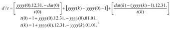 pri čemu je dat(0) - datum nultog perioda, a dat(k) - datum perioda u kome je novčani tok koji se diskontuje.