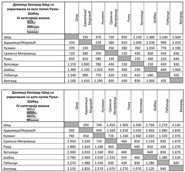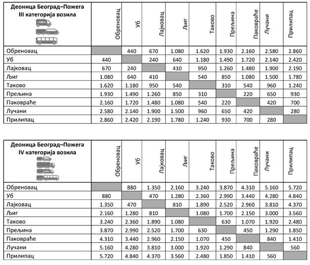 Iznose visine posebne naknade za upotrebu javnog puta, njegovog dela i putnog objekta (putarina) u zavisnosti od kategorije vozila i karakteristične deonice auto-puta za deonicu Beograd - Preševo - Dimitrovgrad sa ukrštanjem sa Moravskim koridorom za IA, I, II, III i IV kategoriju vozila, možete pogledati OVDE