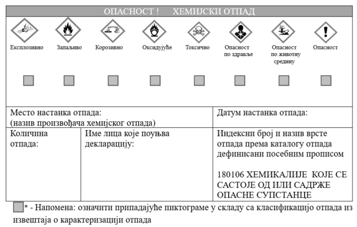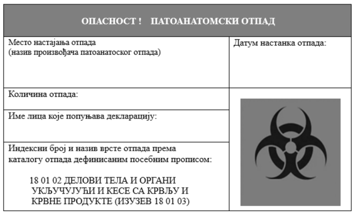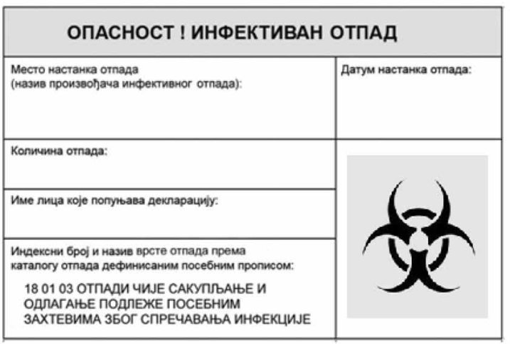 Na ambalažu u kojoj je upakovan razvrstan medicinski otpad stavljaju se nalepnice o opasnosti medicinskog otpada dimenzije najmanje 50 mm x 75 mm, koje sadrže sledeće:
