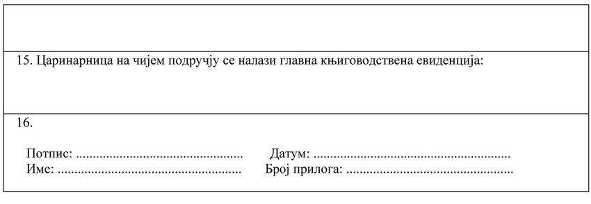 13, 14. i 15. Carinarnice za dokumentaciju/glavnu knjigovodstvenu evidenciju - navesti pune adrese odgovarajućih carinarnica. Ako carinarnice imaju istu adresu, popuniti samo rubriku 13.