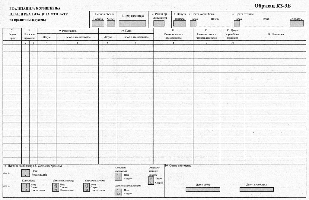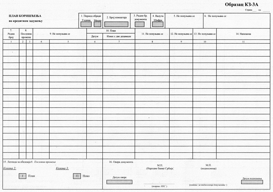 b) plan korišćenja po kreditnom zaduženju (Obrazac KZ-3A), koji se dostavlja uz izveštaj o kreditnom zaduženju (Obrazac KZ-2), osim za kratkoročne bankarske kreditne linije, kredite ili zajmove koji se koriste na revolving osnovi i obaveze po aktiviranoj stranoj garanciji po poslu u Republici;