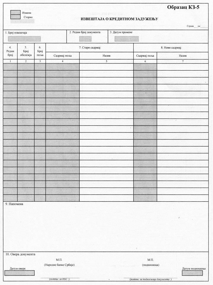 v) izmena ili storno izveštaja o kreditnom zaduženju (Obrazac KZ-5), uz koji se dostavlja sledeća dokumentacija: