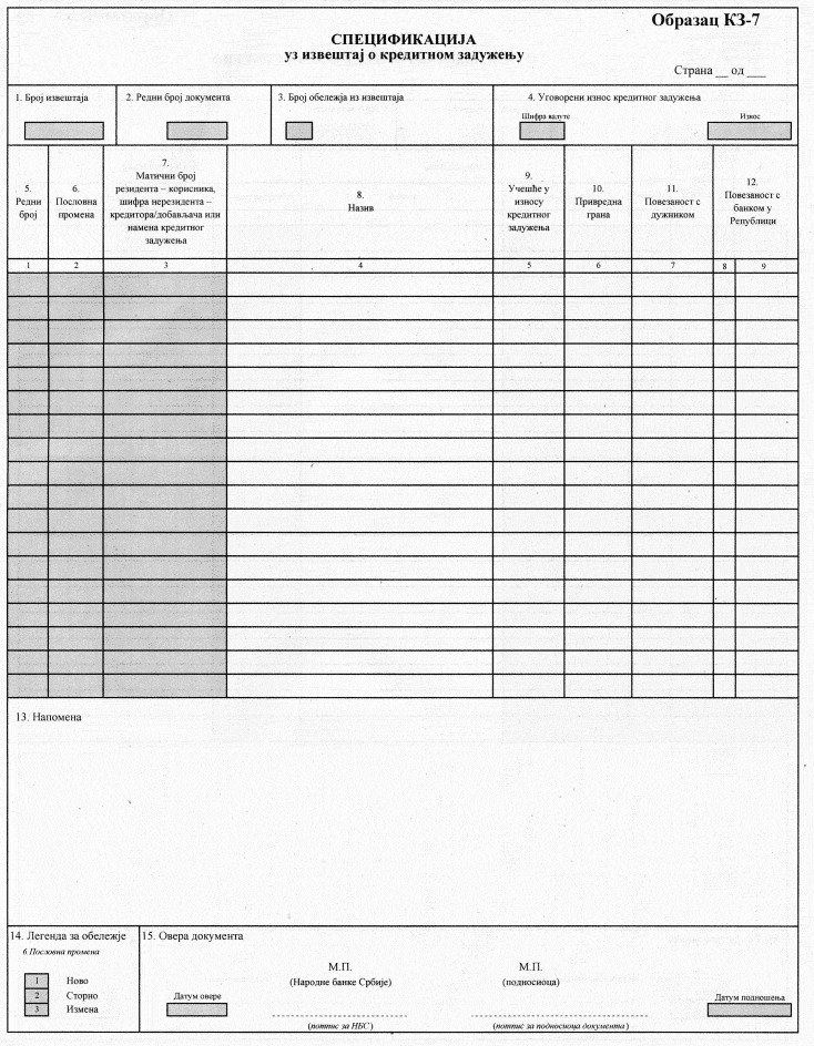 g) specifikacija uz izveštaj o kreditnom zaduženju (Obrazac KZ-7), koja se dostavlja uz izveštaj o kreditnom zaduženju (Obrazac KZ-2) ili uz izmenu tog izveštaja (Obrazac KZ-5), i to ako u kreditnom poslu učestvuje više korisnika kredita, više nerezidenata - kreditora/dobavljača ili se sredstva po tom poslu koriste za više namena, pri čemu se ova specifikacija dostavlja i po sindiciranom kreditu ili zajmu koji grupa stranih kreditora odobrava rezidentu preko agenta;