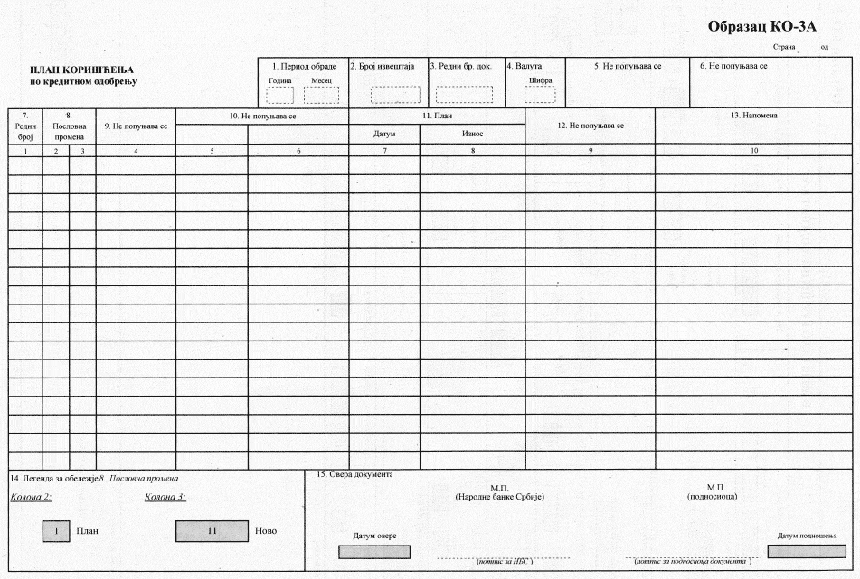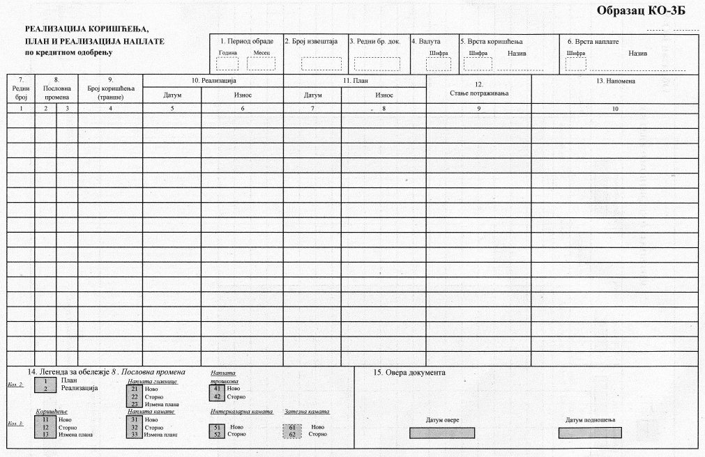 b) plan korišćenja po kreditnom odobrenju (Obrazac KO-3A), koji se dostavlja uz izveštaj o kreditnom odobrenju (Obrazac KO-2), osim za kratkoročne bankarske kreditne linije, kredite ili zajmove koji se koriste na revolving osnovi i potraživanja po aktiviranoj garanciji ili jemstvu datim po kreditnom poslu između dva nerezidenta u inostranstvu;