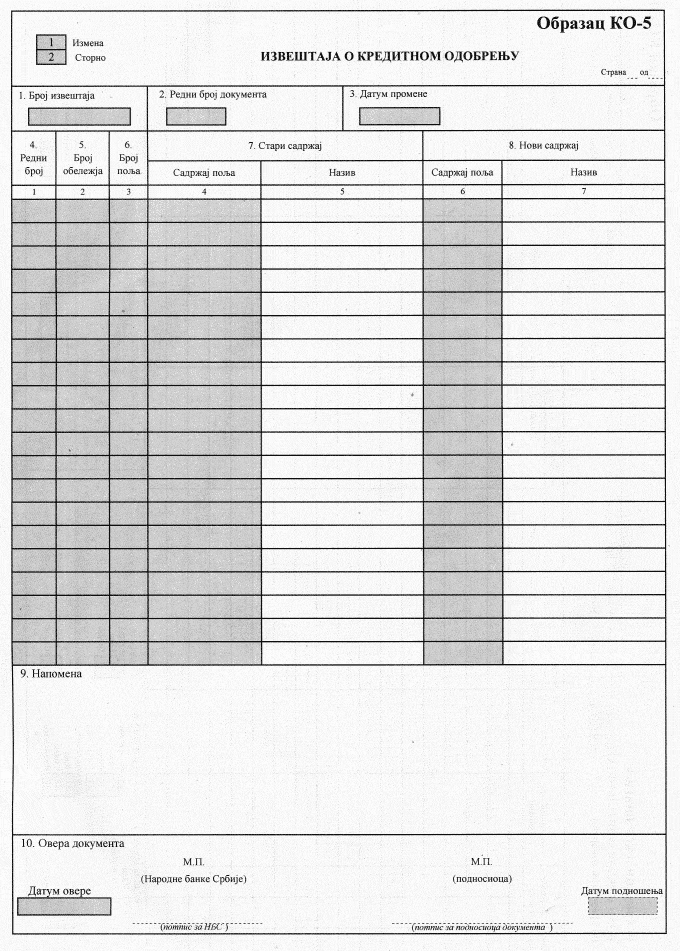 v) izmena ili storno izveštaja o kreditnom odobrenju (Obrazac KO-5), uz koji se dostavlja sledeća dokumentacija: