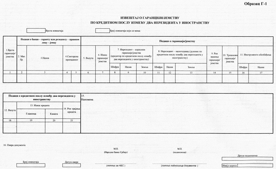 10. O garancijama i jemstvima po kreditnim poslovima između dva nerezidenta u inostranstvu izveštava se pojedinačno - na sledećem obrascu: izveštaj o garanciji/jemstvu po kreditnom poslu između dva nerezidenta u inostranstvu (Obrazac G-1), uz koji se dostavlja sledeća dokumentacija: