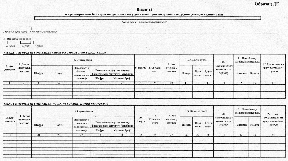 9. O kratkoročnim bankarskim depozitima u devizama koje banka uzima od strane banke (zaduženje) ili odobrava stranoj banci (odobrenje) izveštava se zbirno - na sledećem obrascu: izveštaj o kratkoročnim bankarskim depozitima u devizama s rokom dospeća od jednog dana do godinu dana (Obrazac DE), koji se dostavlja dekadno, i to za prvu i drugu dekadu meseca u roku od pet dana od isteka te dekade, a za treću dekadu - zaključno sa 14. u mesecu za prethodni mesec.