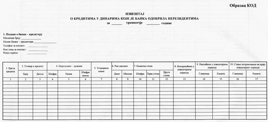 8. O kreditima u dinarima koje banke odobravaju nerezidentima izveštava se zbirno - na sledećem obrascu: izveštaj o kreditima u dinarima koje je banka odobrila nerezidentima (Obrazac KOD), koji se dostavlja tromesečno, i to do 10. januara, 10. aprila, 10. jula i 10. oktobra za prethodno tromesečje u kalendarskoj godini, u elektronskom obliku, u eksel formatu, na imejl adresu: izvestavanje@nbs.rs.