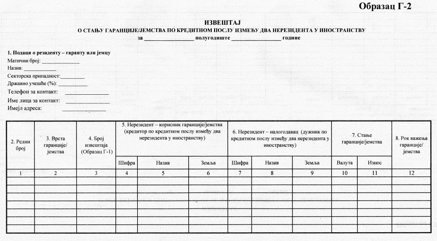 11. O stanju bankarske garancije ili jemstva po kreditnom poslu između dva nerezidenta u inostranstvu izveštava se zbirno - na sledećem obrascu: izveštaj o stanju garancije/jemstva po kreditnom poslu između dva nerezidenta u inostranstvu (Obrazac G-2), koji se dostavlja polugodišnje, i to do 10. januara, odnosno do 10. jula za prethodno polugodište, u elektronskom obliku, u eksel formatu, na imejl adresu: izvestavanje@nbs.rs.