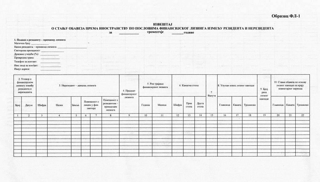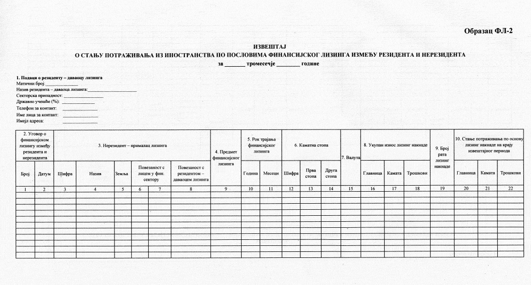 12. O obavezama i potraživanjima rezidenata po poslovima finansijskog lizinga između rezidenata i nerezidenata izveštava se zbirno - na sledećim obrascima: izveštaj o stanju obaveza prema inostranstvu po poslovima finansijskog lizinga između rezidenta i nerezidenta (Obrazac FL-1) i izveštaj o stanju potraživanja iz inostranstva po poslovima finansijskog lizinga između rezidenta i nerezidenta (Obrazac FL-2), koji se dostavljaju tromesečno, i to do 10. januara, 10. aprila, 10. jula i 10. oktobra za prethodno tromesečje u kalendarskoj godini, u elektronskom obliku, u eksel formatu, na imejl adresu: izvestavanje@nbs.rs.