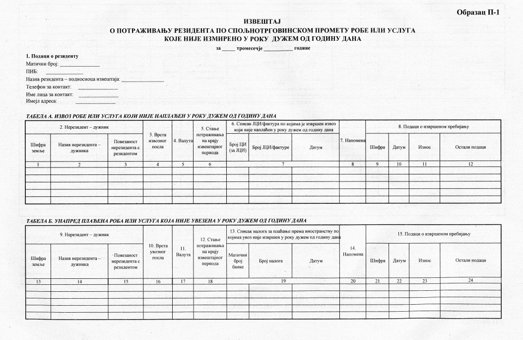 - o izvozu robe ili usluga koji nije naplaćen ili o unapred plaćenoj robi ili usluzi koja nije uvezena u roku dužem od godinu dana od dana izvoza ili avansnog plaćanja (potraživanja po kreditnim poslovima iz člana 4. Zakona) - na sledećem obrascu: izveštaj o potraživanju rezidenta po spoljnotrgovinskom prometu robe ili usluga koje nije izmireno u roku dužem od godinu dana (Obrazac P-1);
