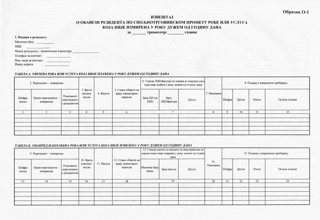 - o uvezenoj robi ili usluzi koja nije plaćena ili o unapred naplaćenoj robi ili usluzi koja nije izvezena u roku dužem od godinu dana od dana uvoza ili primljene naplate (obaveze po kreditnim poslovima iz člana 4. Zakona) - na sledećem obrascu: izveštaj o obavezi rezidenta po spoljnotrgovinskom prometu robe ili usluga koja nije izmirena u roku dužem od godinu dana (Obrazac O-1).