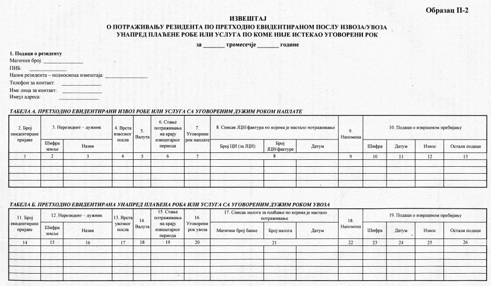 19. O izvozu i uvozu unapred plaćene robe ili usluga sa ugovorenim rokom dužim od 180 dana koji su, u skladu sa odredbama Odluke o evidentiranju kreditnih poslova sa inostranstvom ("Službeni glasnik RS", broj 85/11), evidentirani na Obrascu P-2 a čija realizacija nije okončana do dana početka primene ove odluke - izveštava se zbirno, na sledećem obrascu: izveštaj o potraživanju rezidenta po prethodno evidentiranom poslu izvoza/uvoza unapred plaćene robe ili usluga po kome nije istekao ugovoreni rok (Obrazac P-2).