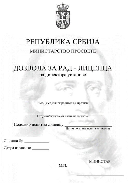 Licenca se štampa na obrascu formata A4, 250 - gramska kunsdruk-mat hartija na kojoj se nalazi u pozadini lik Dositeja Obradovića u svetlo braon boji.