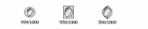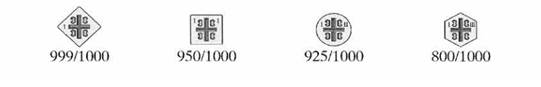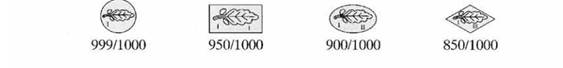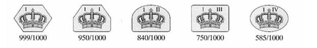- I stepen finoće - kruna sa krstom na vrhu, upisana u pravougaoniku kome su odsečeni gornji levi i gornji desni ugao, tako da se dobije nepravilan šestougaonik;