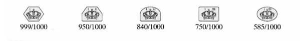 Državni žigovi koji se upotrebljavaju za žigosanje predmeta od dragocenih metala su žigovi za označavanje stepena finoće predmeta od: