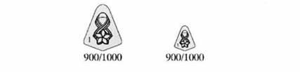 3) veliki i mali žigovi za predmete od zlata koji su izrađeni u finoći 900 (zlatnici, spomen plakete i sl.) - petolisni cvet sa trakom upisan u improvizovanom trouglu.