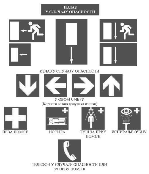 2.1.1. Trajne oznake na tabli moraju da se koriste za oznake zabrane, upozorenja, obaveze i za označavanje izlaza u slučaju opasnosti ili prve pomoći.