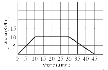 Maja je vozila bicikl 45 minuta. Posle prvih 10 minuta vožnje dostigla je brzinu od 10 km/h. Vozila je tom brzinom narednih 20 minuta, a zatim počela da ravnomerno usporava dok se nije zaustavila. Dopuni dijagram koji prikazuje Majinu vožnju, kao što je započeto.