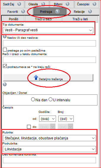 Pretraga > Tip dokumenta: Vesti - Paragraf vesti > Detaljno traženje > Rubrika: Stečajevi, likvidacije, obustave plaćanja